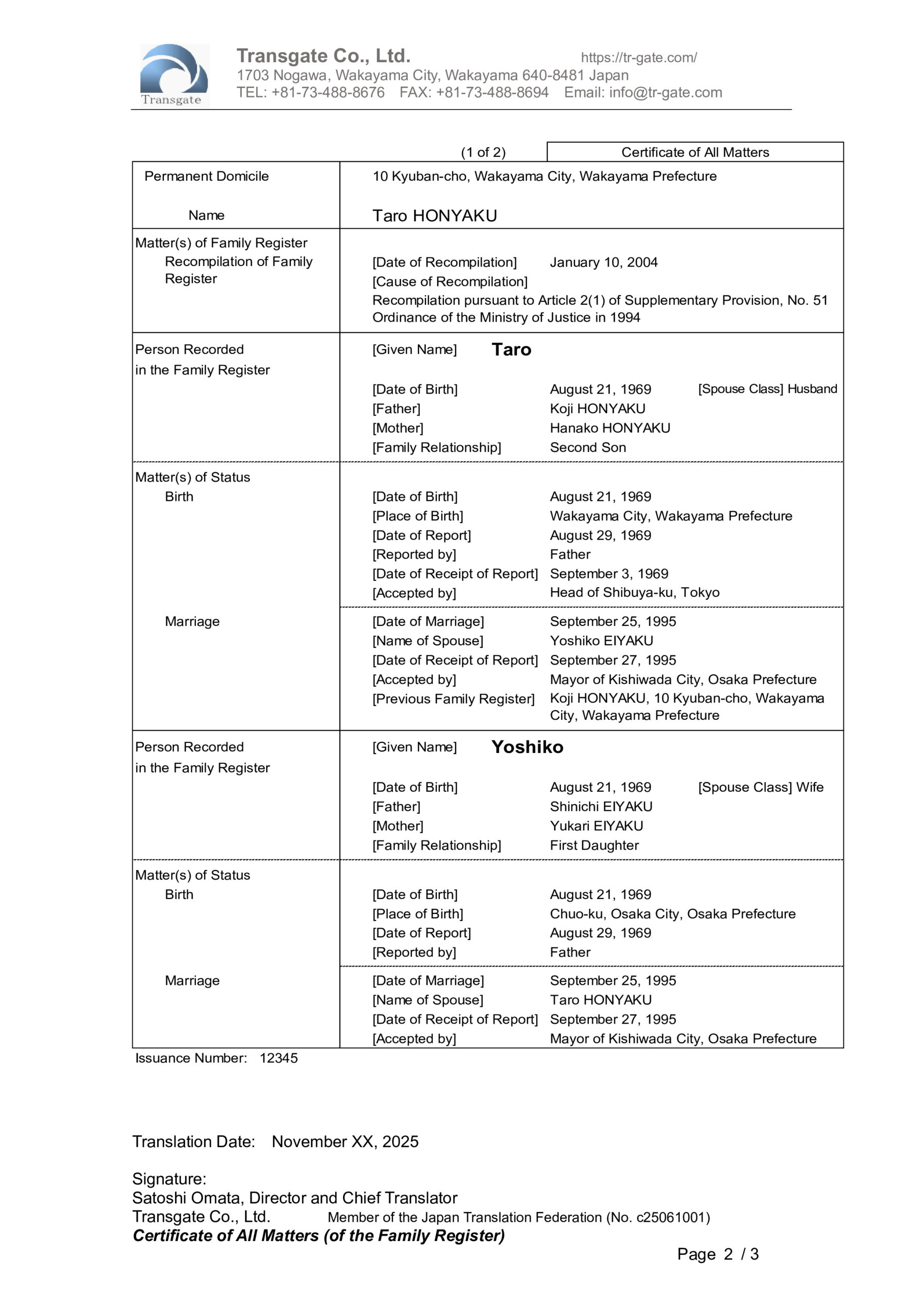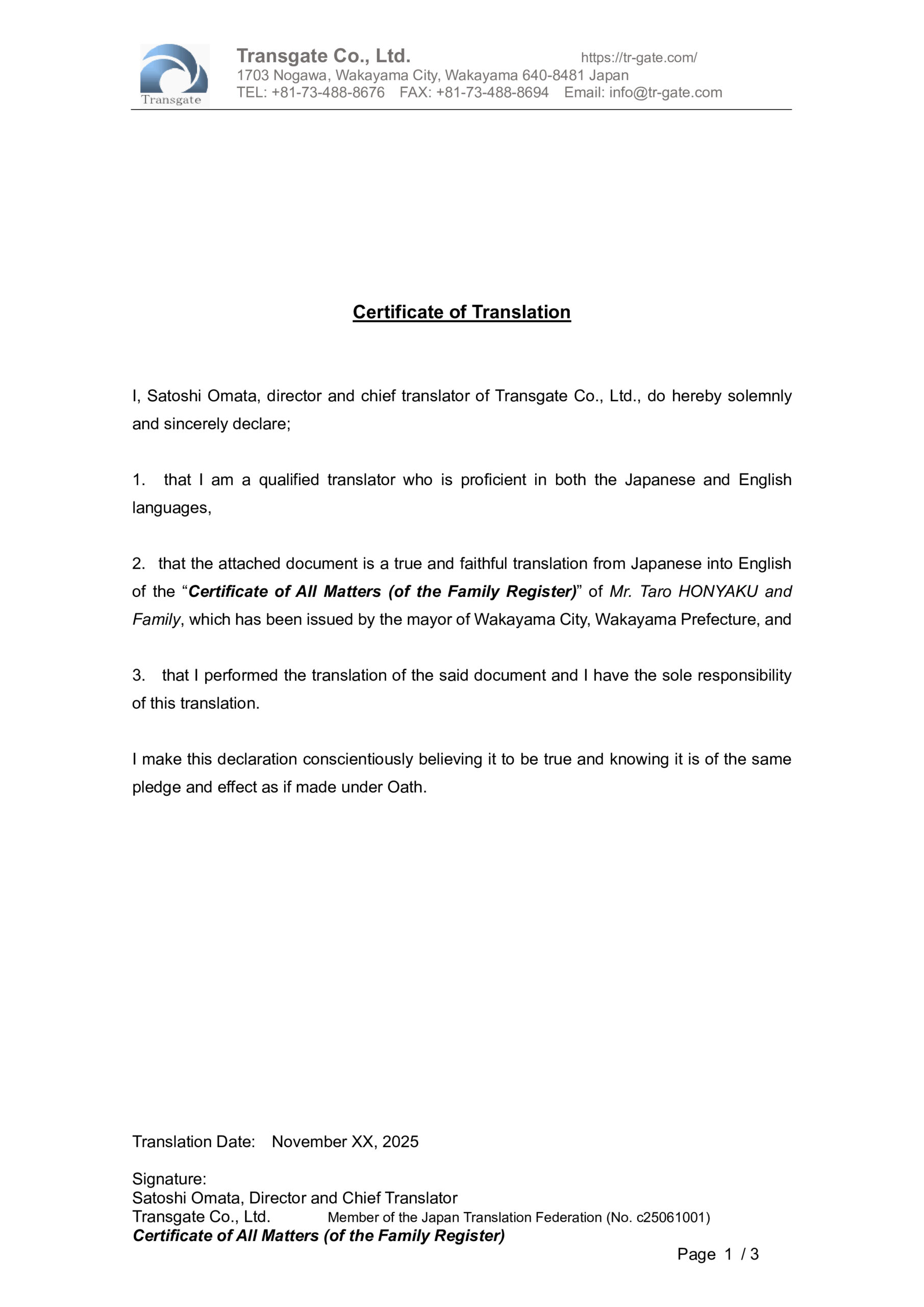 戸籍謄本 翻訳サンプル(翻訳証明書付き)